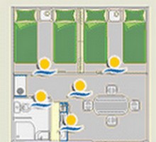 2 chambres : l’une avec 2 petits lits séparés (80×190), l’autre avec 1 grand lit (135×190) + 1 lit d’appoint. Séjour-cuisine avec évier, réchaud gaz, frigo. Cabine sanitaire : douche, lavabo, WC. Terrasse couverte avec salon de jardin.