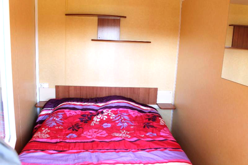 Mobil home 32m². 1 chambre avec 1 lit double (135*190). 2 chambres avec 2 lits côte à côte (80*190). Cuisine : coin repas, évier, plaque de cuisson gaz, grand frigo, micro-ondes, cafetière électrique, vaisselle pour 6 pers., chauffage électrique. Sanitaires : douche, lavabo, wc séparés . Salon de jardin sur dalle béton et store